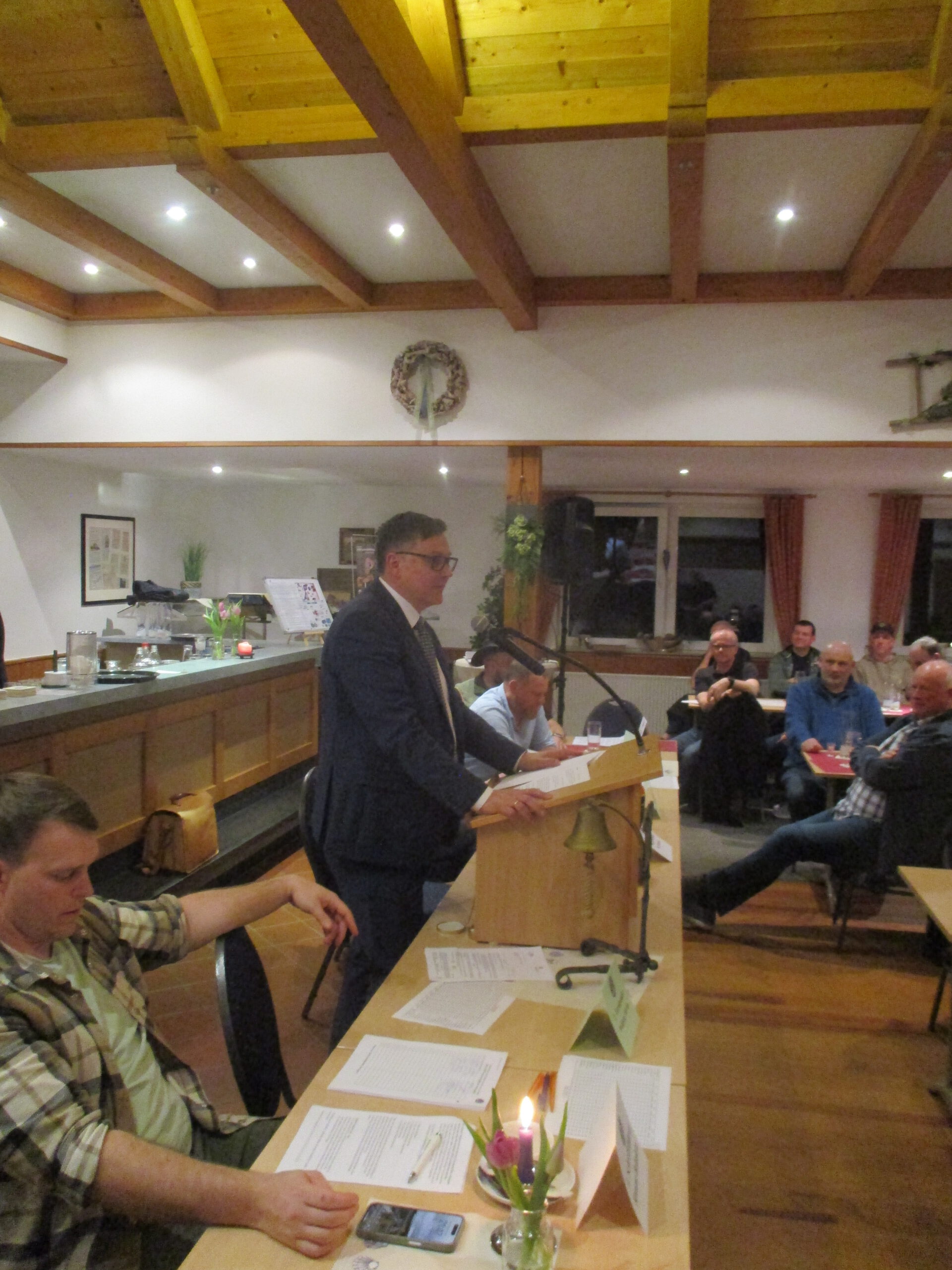 Im Anschluss wurde das Mikro an den Bürgermeister Jörg Skatulla übergeben. Er hielt eine kurze Rede. Er betonte bei dieser Jahreshauptversammlung vieles positives von unserem Verein gelernt zu haben. Vor allem mit dem herausragendem Heringsessen vor der Versammlung und dem kurzem aber einstimmigen Wahlergebnis. Es zeigt, dass unser Vereinsleben auf stabilen Füssen steht.